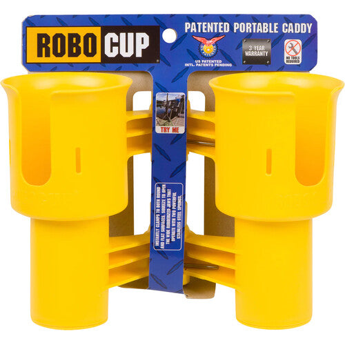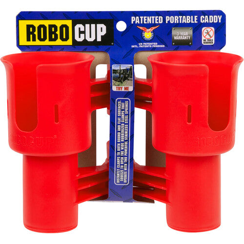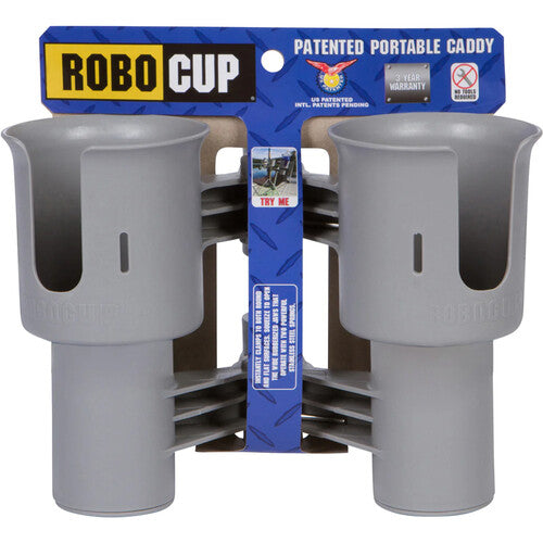 The black RoboCup Dual Cup Holder is a clamp-on drink holder designed to be clamped on to any flat or round surface up to 2" in diameter. The RoboCup's clamping action uses dual rubberized jaws and can further be secured with optional 4" plastic cable ties. The bottom caps are removable to have a deeper space for items such as flashlights and to allow access for cleaning the RoboCup. Two hook-and-loop straps are included for multiple uses, including tightening the cup area to secure drinks of different sizes. The RoboCup is made of polyresin with UV inhibitors added for extra durability. The springs and hardware are stainless steel for rust prevention.