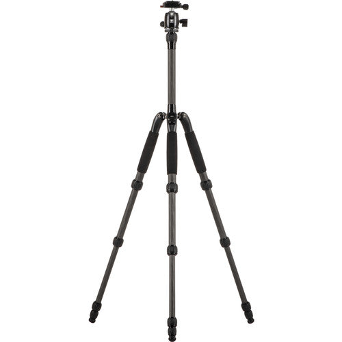 The black T-25SK T-0S Series Travel Tripod with B-00 Ball Head is a 5-section support with carbon fiber legs that extend, along with the 2-stage rapid center column, by unlocking each twist lock section. Therefore, the tripod can reach a maximum height of 53.8". With three variable leg angles, independent leg spread, and the removable center column, the legs can completely splay out to have a minimum height 3.1". To store or carry the 2.2 lb tripod, the legs fold 180° to produce a compact 12.2" support.