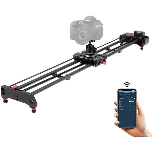 En lugar de utilizar un controlador cableado, el 47" Control deslizante de cámara motorizado inalámbrico de fibra de carbono de GVM Te permite gestionar y controlar el movimiento motorizado mediante una aplicación iOS/Android desde tu smartphone o tablet. Establece puntos de recorrido A a B y sesiones de time-lapse con fotogramas clave mediante una conexión inalámbrica Bluetooth, y captura vídeos e imágenes fluidos y de aspecto profesional. Este control deslizante accionado por correa se puede utilizar en configuraciones horizontales e inclinadas con trípode, con cámaras de hasta 5 kg (11 lb) en horizontal. Incluye una rótula para ajustar fácilmente la inclinación y el giro de la cámara. El carro del control deslizante incluye un nivel de burbuja para comprobar el equilibrio de la cámara.