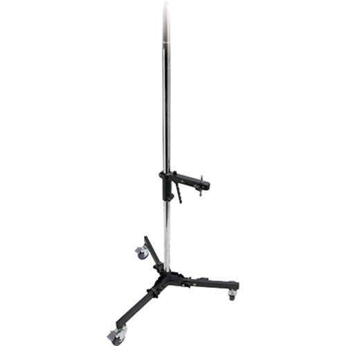 Steel column roller stand with a braked wheel allows you to get your lights mobile in the studio or on location with ease and convenience. It features an 8' chrome plated steel tube and a spring-loaded sliding arm which can be mounted with a lighting fixture, camera, Tethermate or anything with baby pin/receiver. The height of the sliding arm can be quickly adjusted with only one hand from floor level to the top of column. The fold-away base with wheels can be removed easily to facilitate storage or transport.