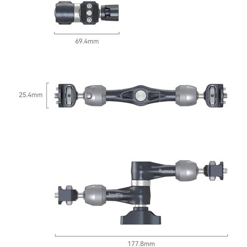 Mount a monitor, light, or accessory onto your camera rig at almost any angle with this 7" long Magic Arm with Rosette Gear from SmallRig. The aluminum and stainless steel arm features 1/4"-20 thumbscrews on either end. Both ball heads and the center joint are secured using a large center locking lever, and the sections connect by a 360° rotating center rosette joint.