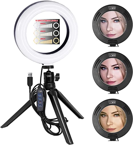The Vidpro RL-6  6" Inch LED Ring Light is perfect for portrait photography, fashion modeling, makeup artists, vloggers and influencers. Its balanced and evenly diffused lighting brings out detail and eliminates harsh shadows. An easy to use push button digital control for adjusting 10 levels of brightness and 3 levels of color temperature 2800K, 4500K, 6500K. The built-in 6 foot long USB cable provides ample flexibility in any environment. The Vidpro RL-6 can be used as a studio fill-light and to create an attractive circular ‘catch light’ in the subjects eyes. Also great for close-up macro shots, product and food photography and detailed table-top work. The unit can mount onto any tripod or light stand via the 1/4-20" socket on the underside. It is fully compatible with cameras, video camcorders, DSLRs and all smart phones. The complete kit includes a table-top tripod and adjustable ball head. Conveniently powered by any USB plug (not included) USB port in desktop or laptop computers or portable power banks.